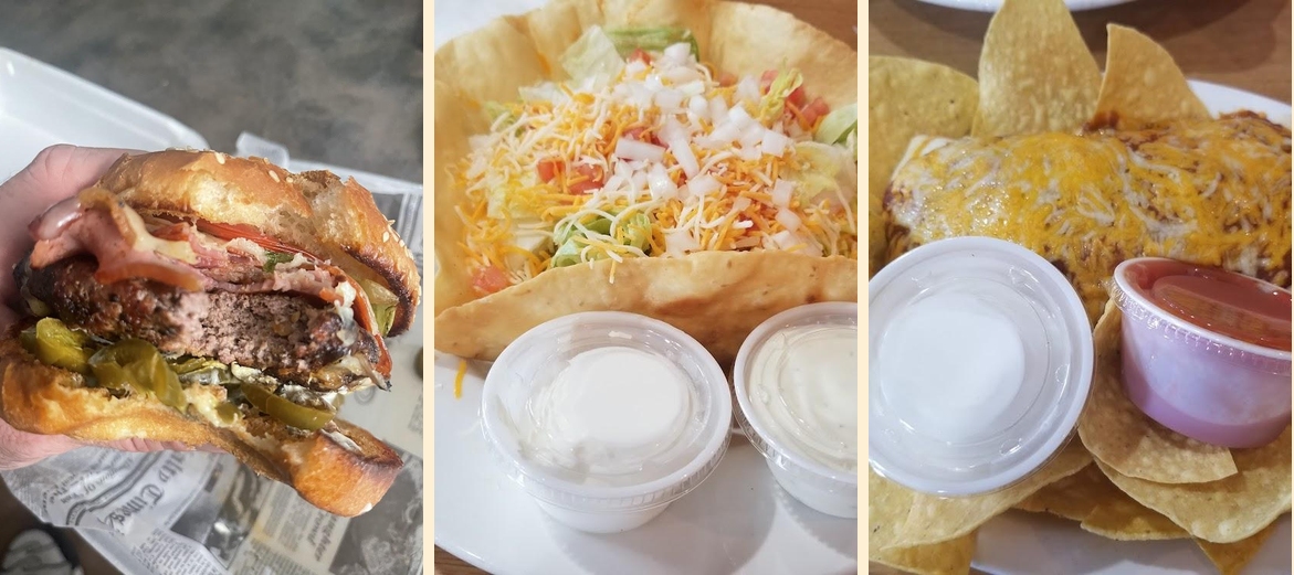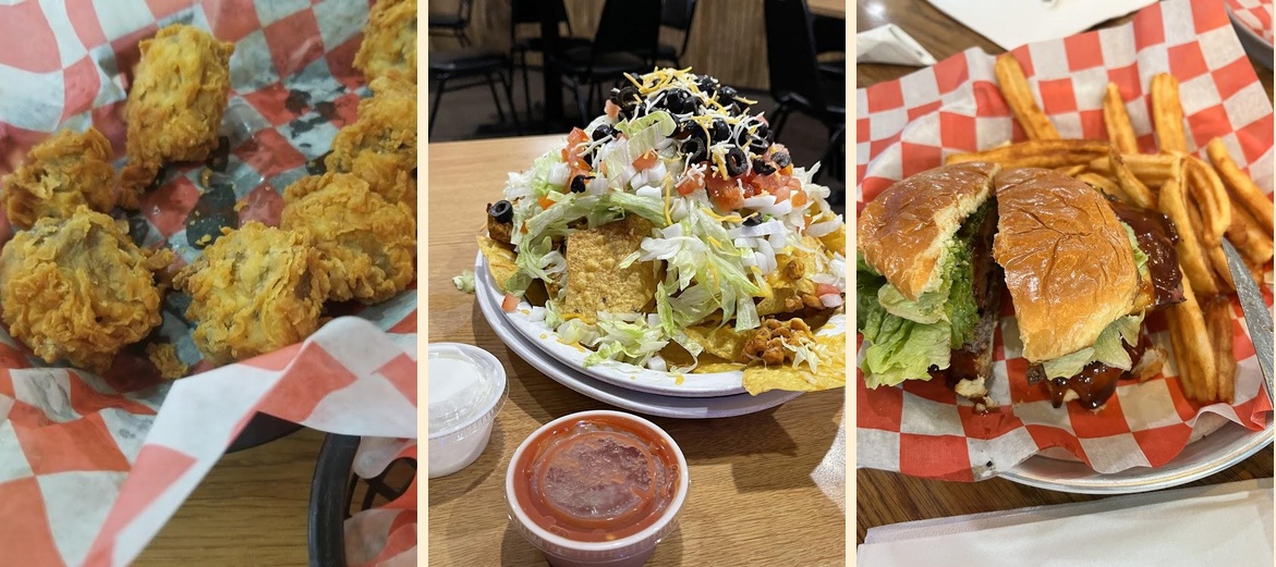 TJ's has a range of unique dishes like House Smoked Brisket Sandwich and Taco Pizza. The menu also features favorites like pulled pork sandwiches and smoked beef brisket nachos.