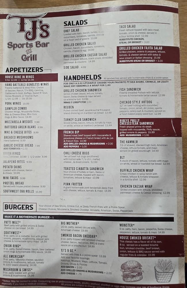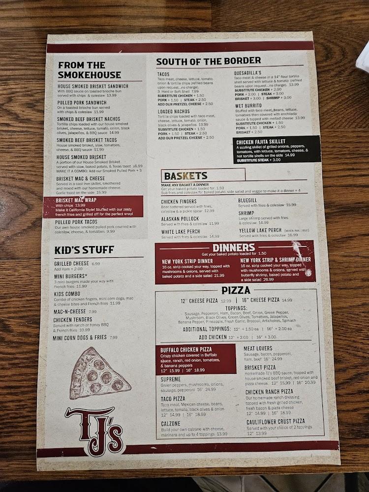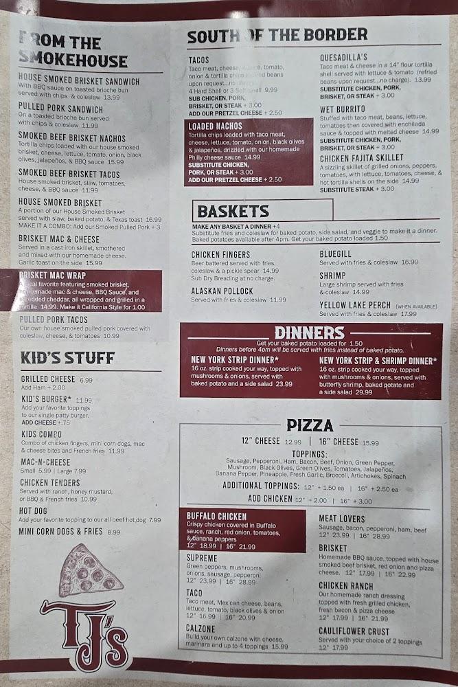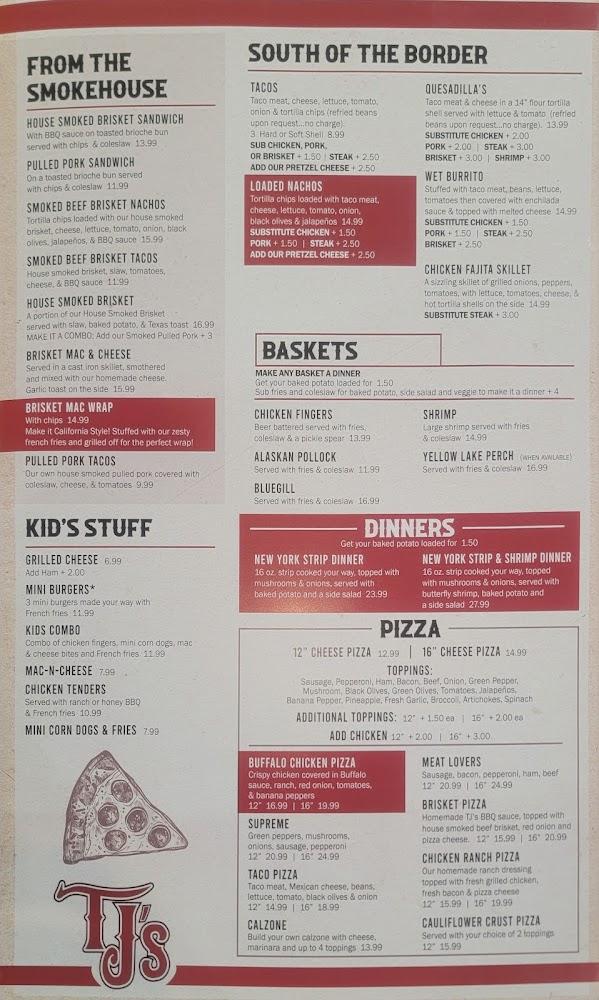 The menu at TJ's is diverse, offering something for everyone. From mouthwatering burgers to loaded nachos, you'll find plenty to choose from. The smoked meat section features sandwiches like the house smoked brisket. Tacos fill the south of the border category, offering fresh, flavorful bites. Don't miss the kid's menu, which includes favorite items for younger diners.
